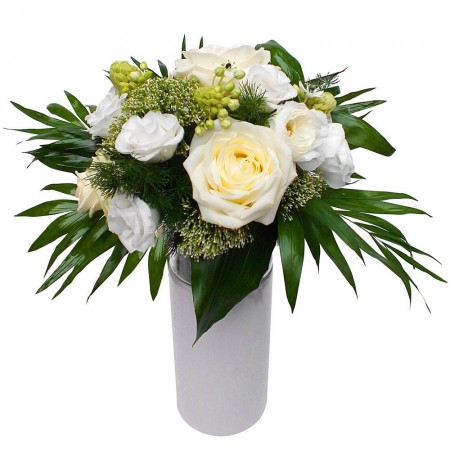 Ravissant bouquet rond lié ,composé des fleurs blanches assorti .Prix hors vase