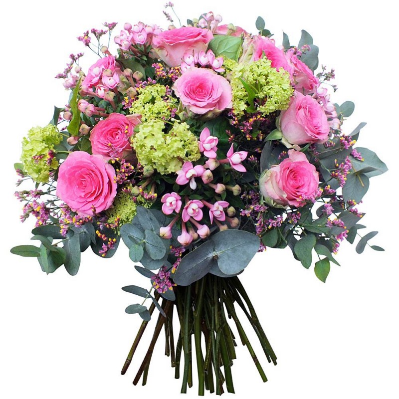 Ravissant bouquet lié de forme rond composé dans les teintes tendre de rose et vert