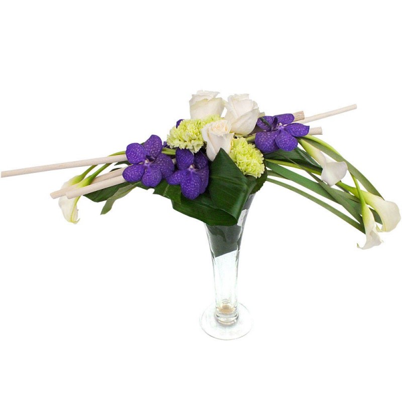 Sompteux assemblage piquer sur mousse travailler dans un élégant vase en verre . De forme horizontal et moderne poetiquement assembler avec des roses et d'orchidées vanda violette